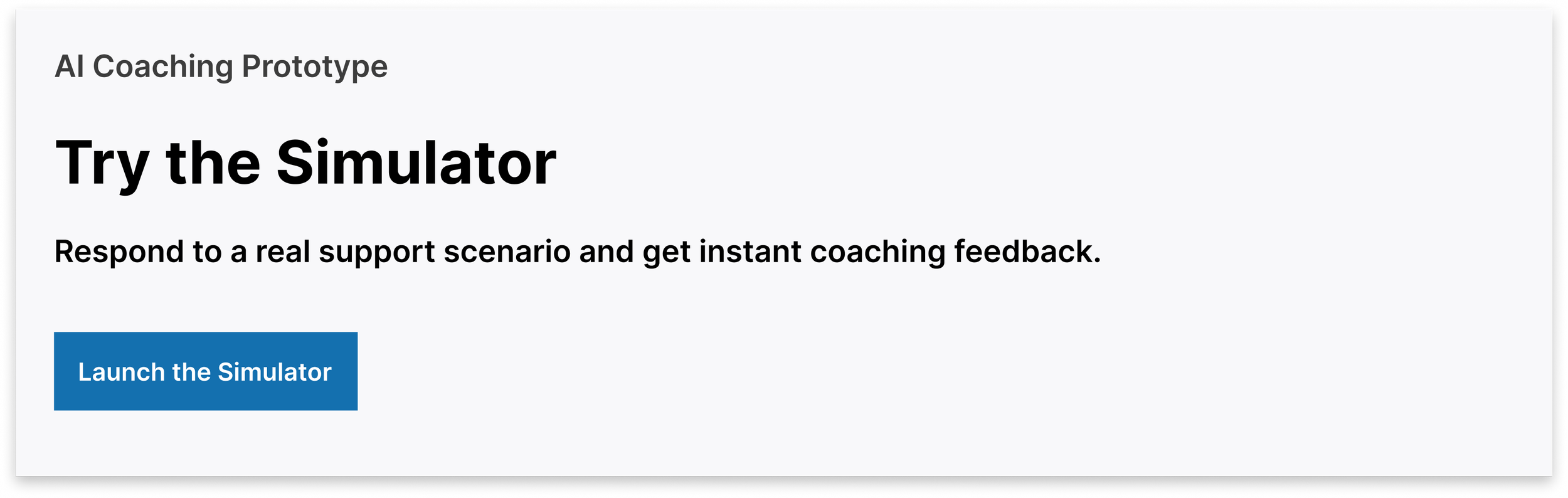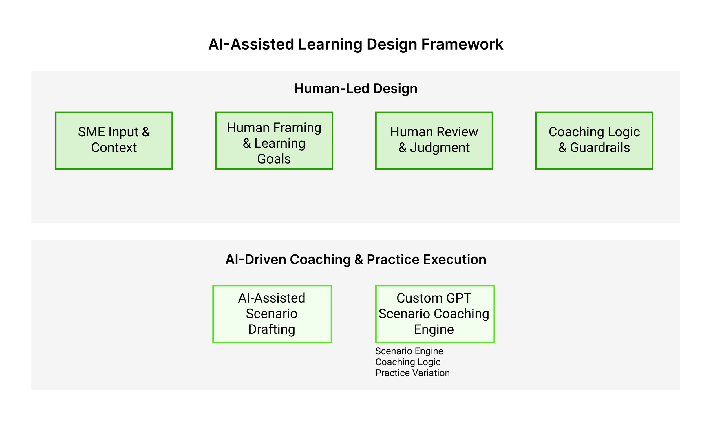 The AI Support Agent Scenario Coach was designed using a human-centered approach, with clear learning goals, coaching intent, and guardrails defined before AI was introduced. AI is used to support scale and consistency, while human judgment remains central to instructional and coaching decisions.
