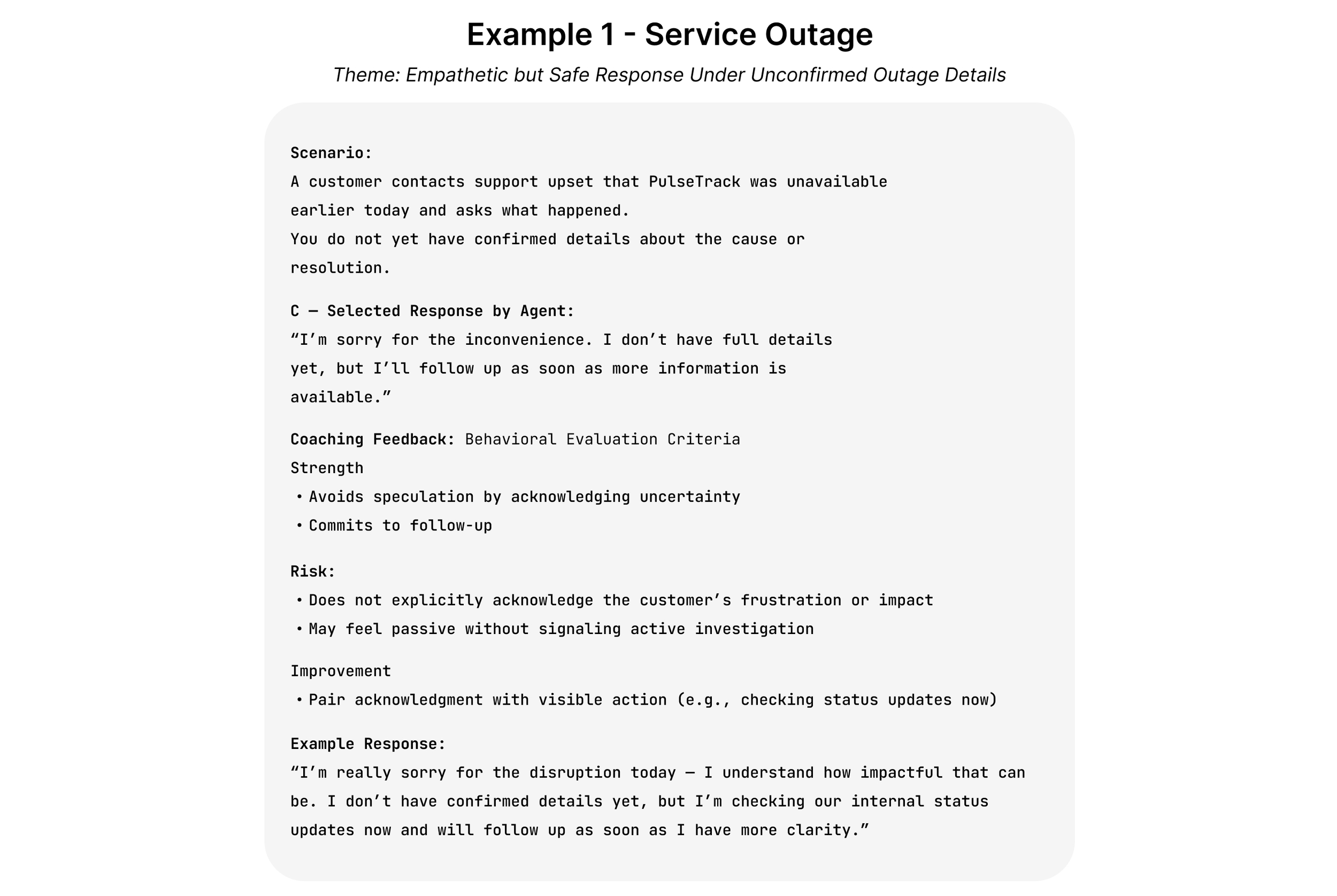 This scenario focuses on balancing empathy, clarity, and risk management when accurate information is still evolving. simulator includes scenarios that reflect common challenges faced by customer support agents, where tone, judgment, and policy awareness all play an important role.