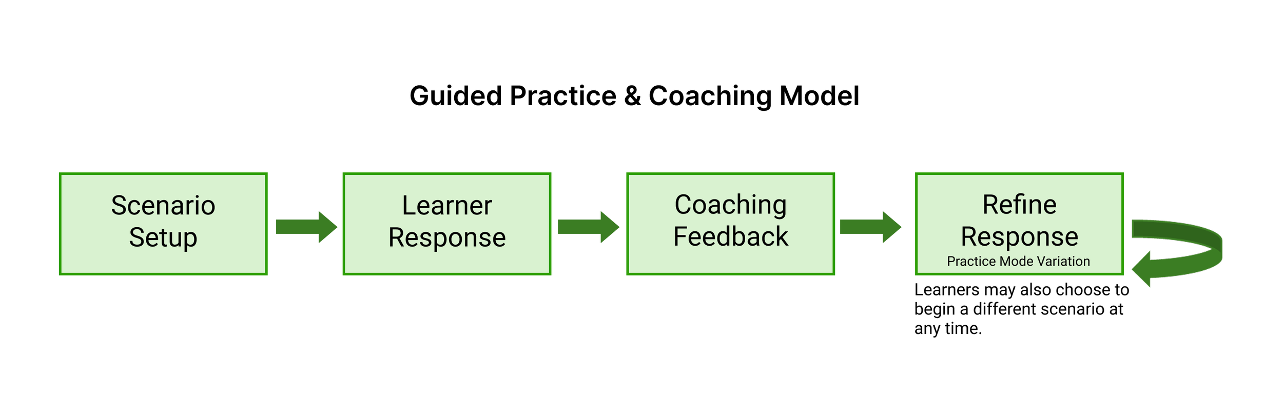 This simulator is designed as a guided practice loop, allowing learners to respond to realistic scenarios, receive coaching feedback, and retry safely.